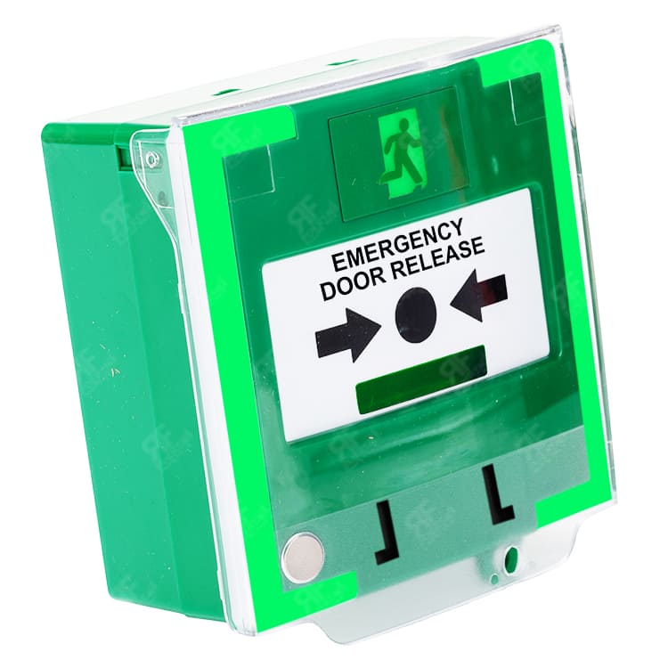 Los puntos de llamada manuales verdes tienen protección de cubierta de prealerta una vez que se levanta la cubierta, pantalla iluminada clara y alerta sonora, los interruptores de cambio multipolares están ubicados junto a una salida y se utilizan para liberar manualmente una puerta mientras se intenta evacuar el edificio en caso de una emergencia.