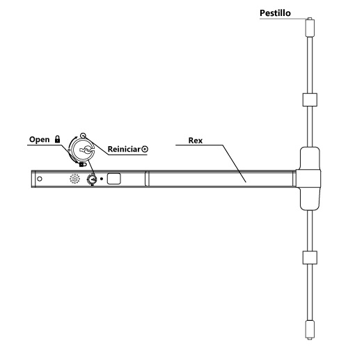 Si se presiona la barra táctil durante más de 2 segundos, se activa la alerta. Tras un retardo de 1 a 15 segundos (según la configuración), la alarma se detiene y se puede abrir la puerta. Se puede usar la llave o el sistema de control de acceso para detener la alerta y abrir la puerta.