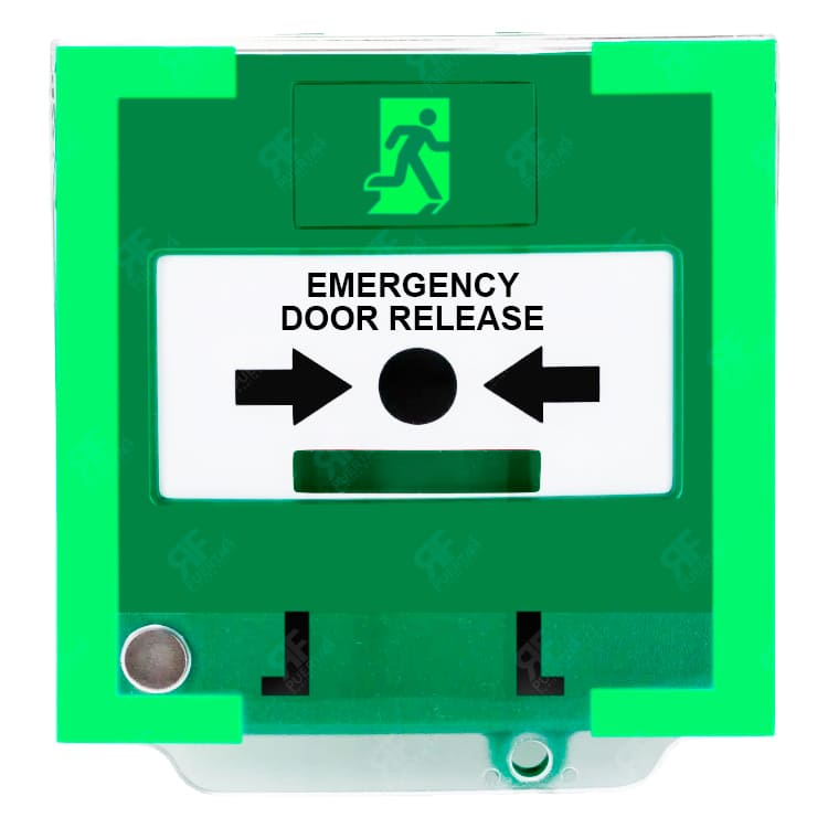 Los puntos de llamada manuales verdes tienen protección de cubierta de prealerta una vez que se levanta la cubierta, pantalla iluminada clara y alerta sonora, los interruptores de cambio multipolares están ubicados junto a una salida y se utilizan para liberar manualmente una puerta mientras se intenta evacuar el edificio en caso de una emergencia.