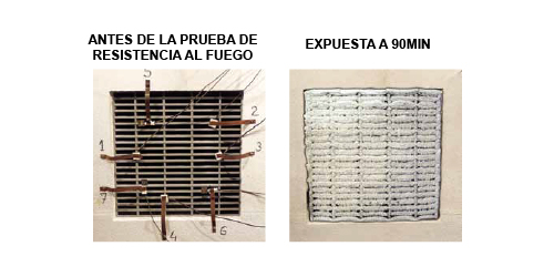 Unión de varias rejillas intumescentes: Las rejillas se han probado separadas mediante barras de silicato cálcico incombustibles de ancho de 30mm (densidad 640kg/m3) x espesor de las rejillas (40, 50, 60mm).