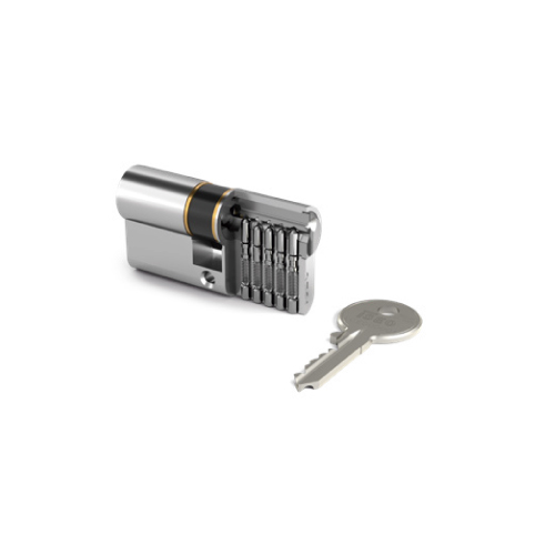 F5 tiene 5 pistones de cifrado de una longitud de 30-30 de latón especial resistente al desgaste, por cada lado de cierre. El cilindro de perfil lleva integrada una protección antiganzúa. La superficie del cuerpo del cilindro está niquelada mate o es de latón de serie.