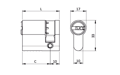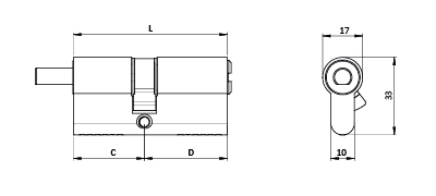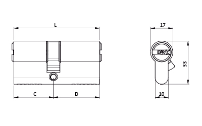 Tres hendiduras de perfil superpuestas en el rotor aumentan la seguridad del cilindro de perfil contra aperturas no autorizadas (llave de perfil paracéntrica). Las llaves son de latón niquelado. Características opcionales: