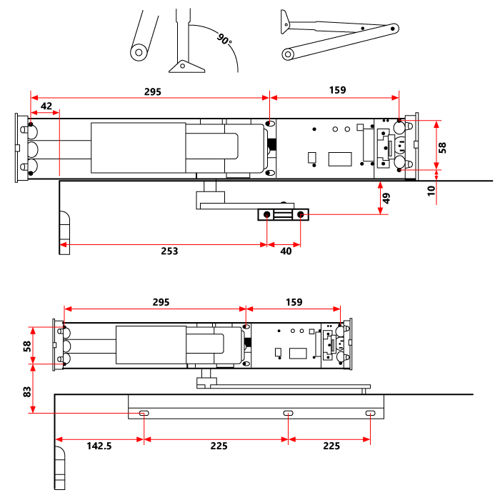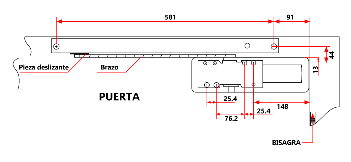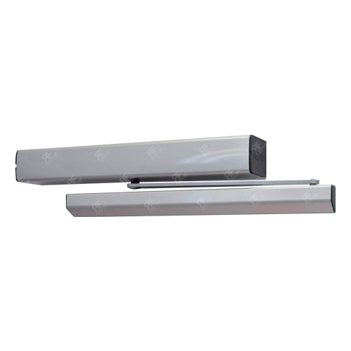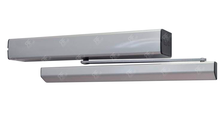 Cierrapuertas de alta resistencia con brazo deslizante de retención controlado eléctricamente para controlar puertas con barrera contra incendios y humo.